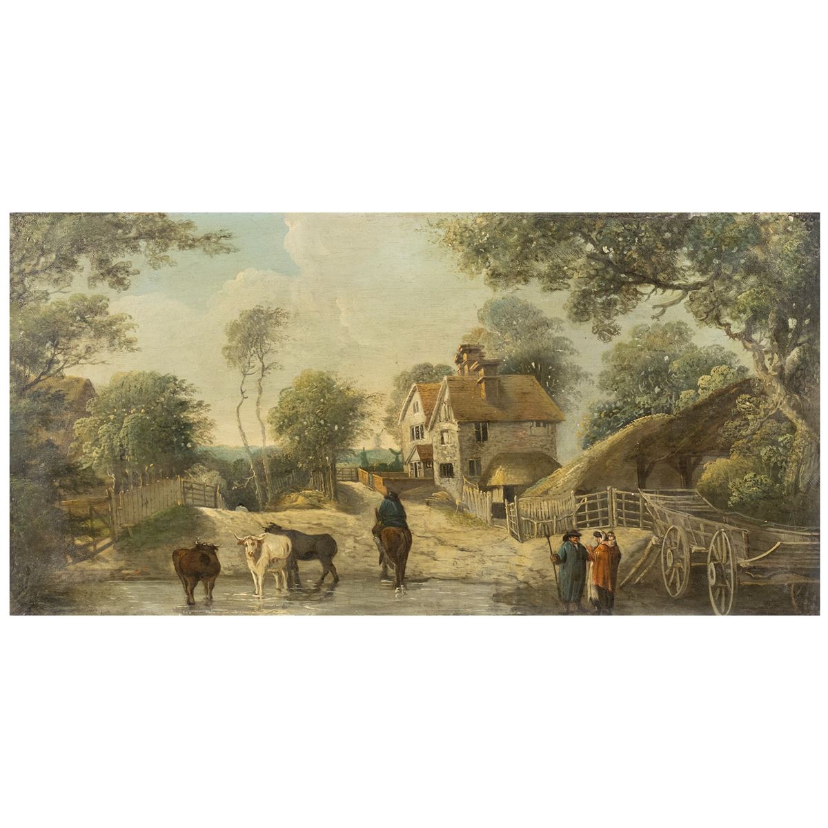 Scuola Inglese - "Paesaggio campestre con figure", olio su tavola - 29x57 cm. -