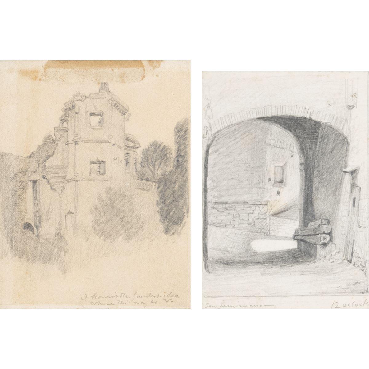 • Lot n° 0484 Elihu Vedder - "Rovine e scorcio di paese", coppia di disegni a matita e carboncino su carta, uno siglato in basso a destra, entro cornici - 11x8,5 cm. - 10,5x7,5 cm. -