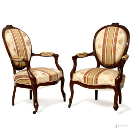 Coppia di poltroncine in noce con gambe mosse. Seduta, braccioli e schienale imbottiti e rivestiti in tessuto, XX secolo, cm 93x63x43, (rotture e mancanze)