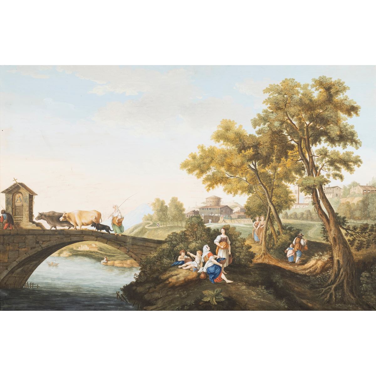 • Lot n° 0403 Cosimo Minucci - "Paesaggio con ponte, figure e armenti", 1814, olio su carta applicata su tela, firmato e datato in basso a destra - 64x95 cm. -