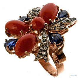 • Lot n° 0055 Anello in oro 9 kt, argento, corallo, diamanti taglio vecchio e zaffiri 4 ct ca, misura 16, peso lordo gr 9