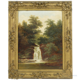 Paesaggio con cascata, olio su tela, sec. XIX, cm 41x30,5, entro cornice, (difetti)