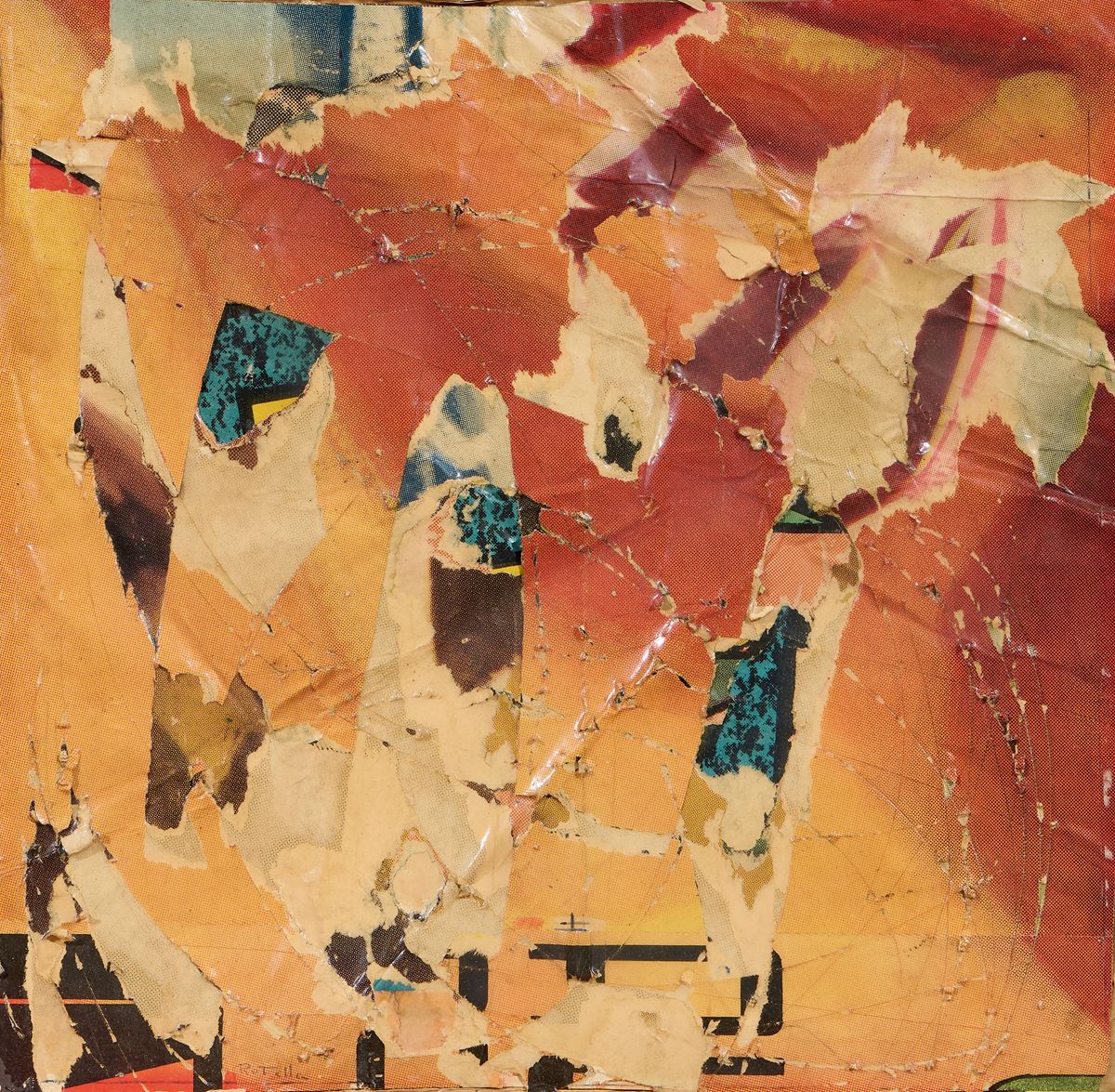 • Lot n° 0622 Senza titolo - Firma in basso a sinistra: Rotella. Su un cartone al verso della cornice: etichetta con dati dell'opera. - cm 37x39 - Décollage su cartone, manifesti, colla
