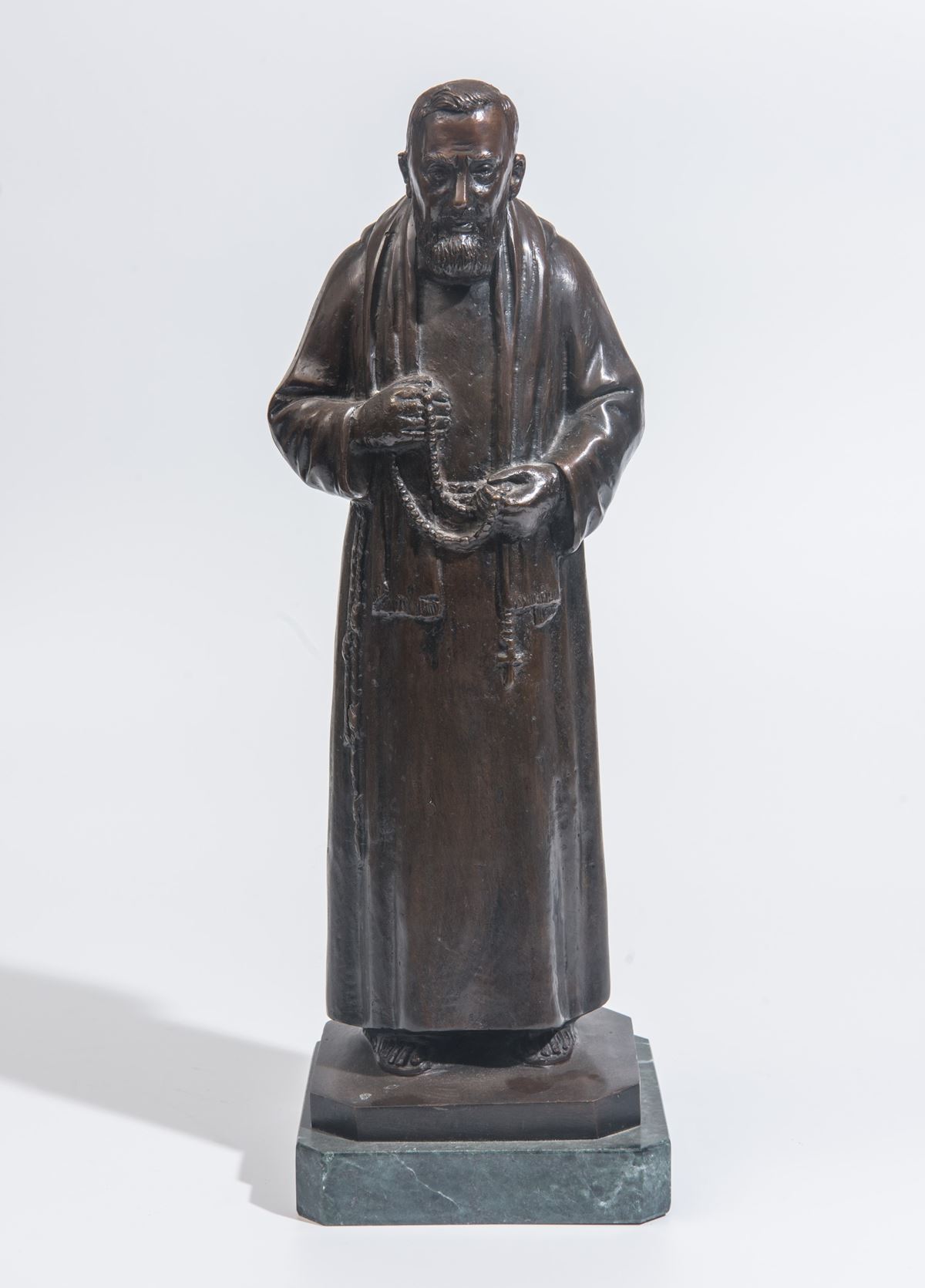 Statua in bronzo a firma "De Santis" - Raffigurante figura di religioso in abito monastico, poggiante su base in pietra.I lotti oggetto della presente asta sono ubicati presso un’abitazione privata sita in Roma.La partecipazione all’asta implica la piena accettazione della condizione secondo cui il ritiro dei beni aggiudicati sarà interamente a cura, rischio e spese dell’aggiudicatario.Resta inteso che eventuali operazioni di smontaggio, imballaggio, trasporto e ritiro dovranno essere organizzate direttamente dall’aggiudicatario.Si raccomanda pertanto di richiedere preventivamente tutte le informazioni necessarie, anche al fine di acquisire eventuali preventivi per il trasporto prima di formulare un’offerta. - 40 x 15 cm -