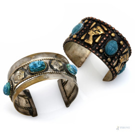 Coppia di bracciali etnici rigidi in metallo argentato e pietre dure, diametro cm 7