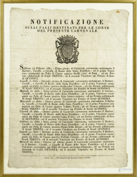 • Lot n° 0518 Notificazione sulli palij destinati per le corse del presente carnevale, Roma, 1830, cm 61x45,5 circa, entro cornice (difetti)