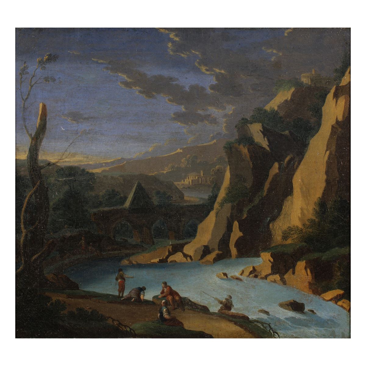 Scuola fiamminga - "Paesaggio fluviale con figure" , olio su tela, entro cornice in legno dorato - 37x40,5cm. -