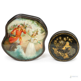 Lotto di due scatole in papier-machè laccato nero e rosso, decorate con scene figurate, XX secolo, misura max cm 3x13,5x14,5