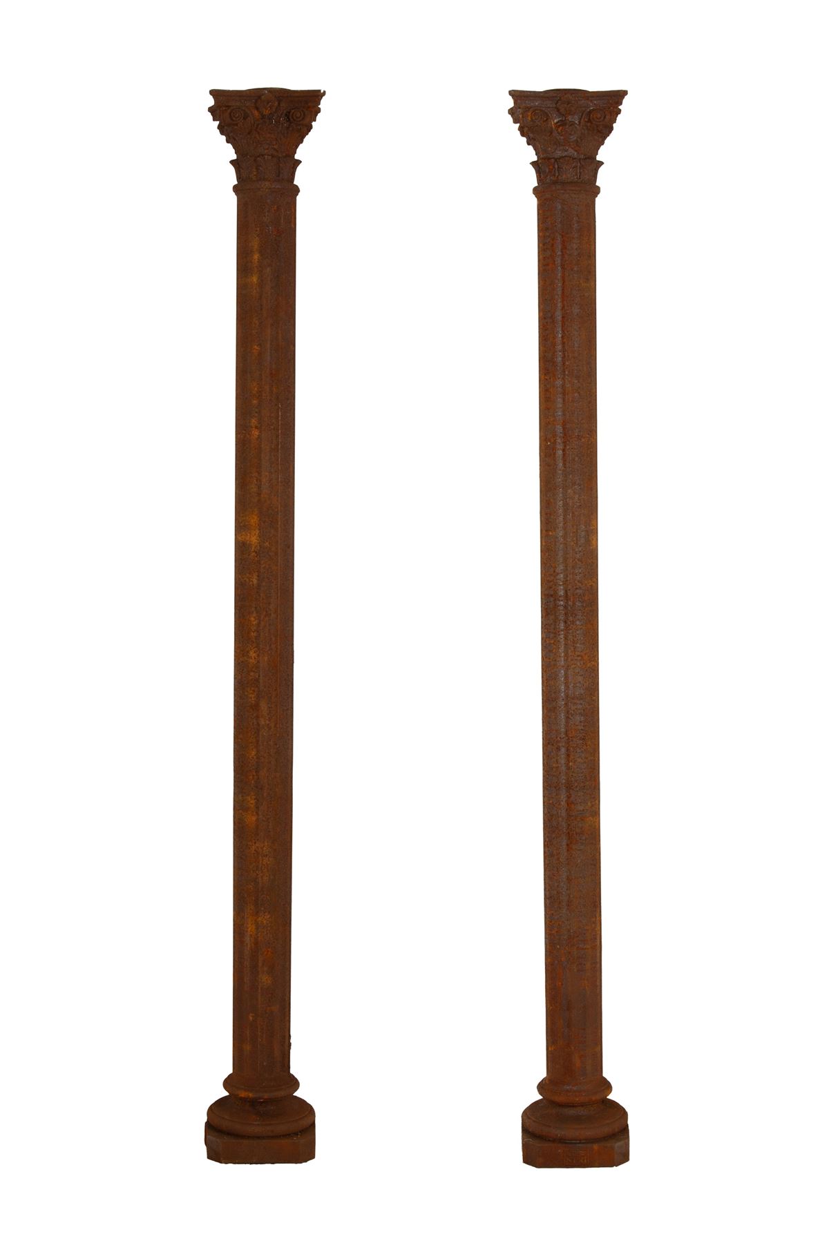 • Lot n° 0154 Coppia di colonne in ghisa - Coppia di colonne in ghisa stampigliate con capitelli. Marcate Fonderia NERI. - 219x24x24 cm ca. -