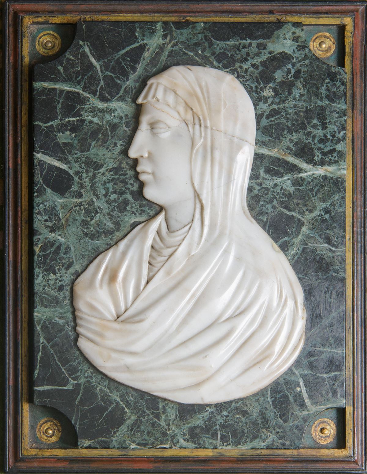 • Lot n° 0069 Bassorilievo - Elegante bassorilievo in marmo bianco su fondo in marmo verde Alpi, raffigurante busto femminile di profilo con capo velato. - 54 x 40 cm - marmo bianco
