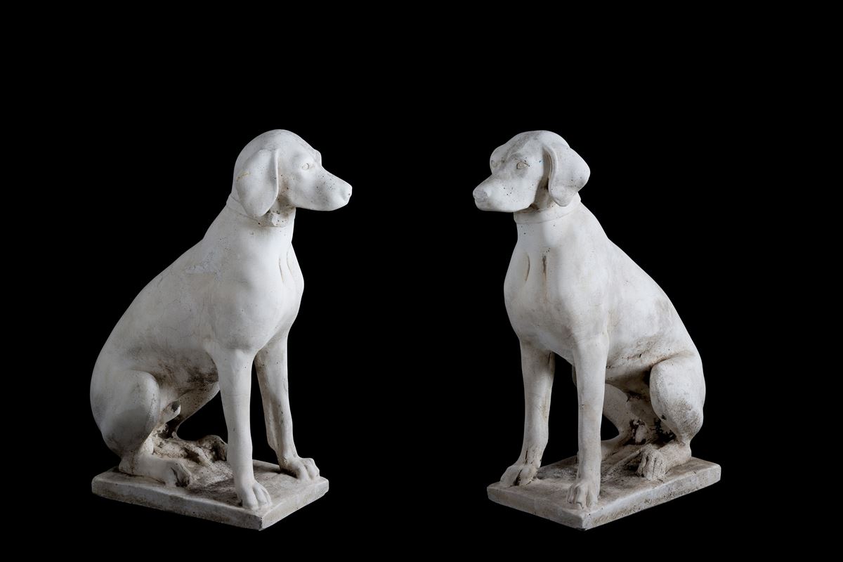 Coppia di sculture "SEGUGI" - Coppia di sculture in agglomerato di pietra raffiguranti "SEGUGI". - 72x26x38 cm ca. -