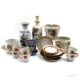 • Lot n° 0564 Lotto di vari articoli in maiolica e porcellana decorata, XX secolo, altezza massima cm 20, (rotture,difetti, segni di usura)