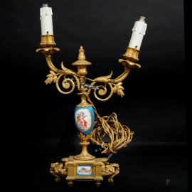 • Lot n° 1044 Candelabro a due fiamme in bronzo dorato e porcellana policroma, XIX-XX secolo, trasformato a lampada, cm h 38,5, (difetti, parte rotta)