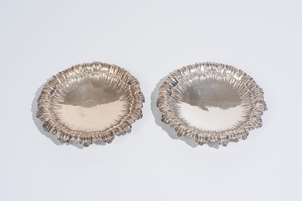• Lot n° 0030 Due piattini in argento - Peso: 243 gr. I lotti oggetto della presente asta sono ubicati presso un’abitazione privata sita in Roma.La partecipazione all’asta implica la piena accettazione della condizione secondo cui il ritiro dei beni aggiudicati sarà interamente a cura, rischio e spese dell’aggiudicatario.Resta inteso che eventuali operazioni di smontaggio, imballaggio, trasporto e ritiro dovranno essere organizzate direttamente dall’aggiudicatario.Si raccomanda pertanto di richiedere preventivamente tutte le informazioni necessarie, anche al fine di acquisire eventuali preventivi per il trasporto prima di formulare un’offerta. - d. 13 cm -