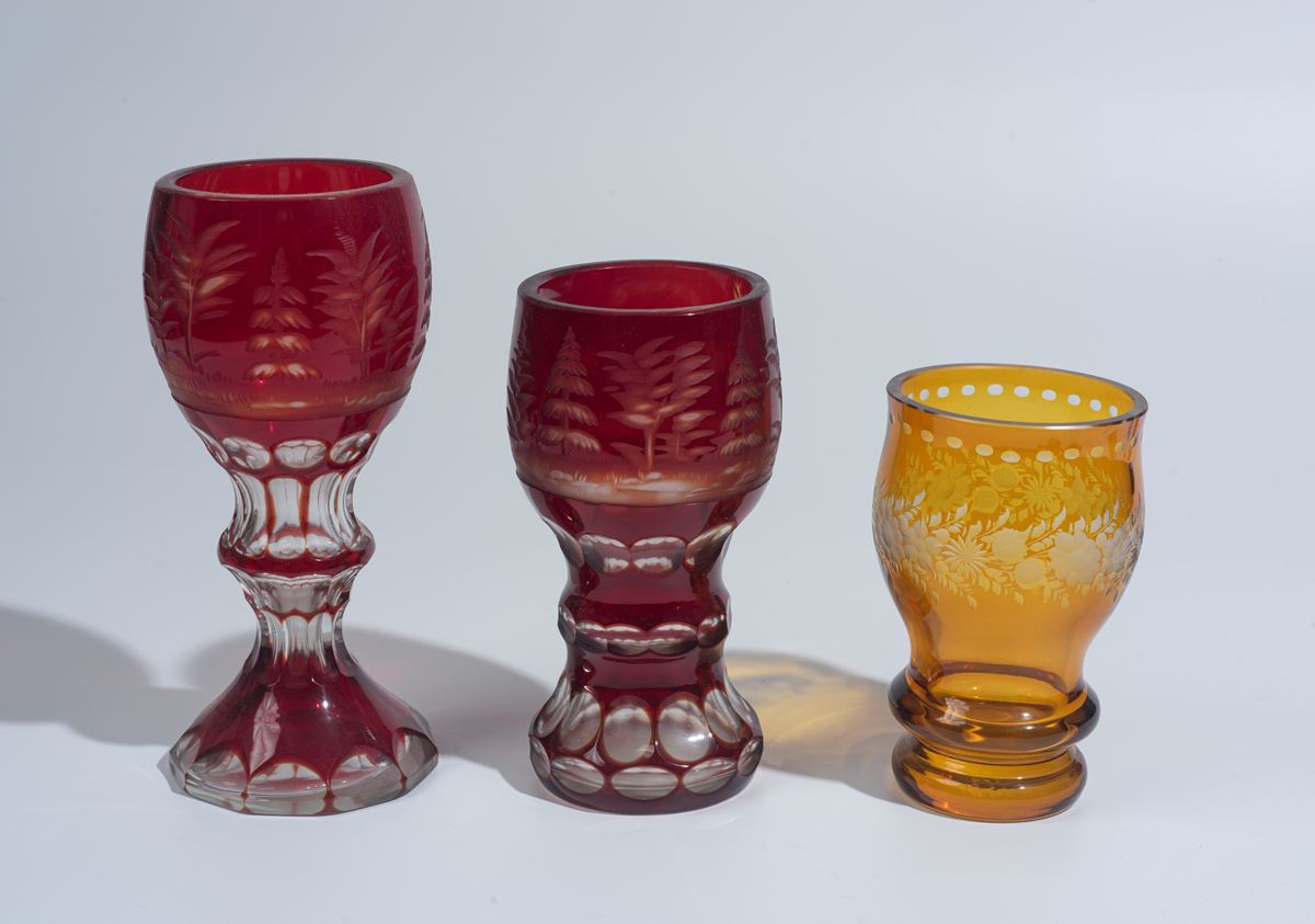 Tre bicchieri - I lotti oggetto della presente asta sono ubicati presso un’abitazione privata sita in Roma.La partecipazione all’asta implica la piena accettazione della condizione secondo cui il ritiro dei beni aggiudicati sarà interamente a cura, rischio e spese dell’aggiudicatario.Resta inteso che eventuali operazioni di smontaggio, imballaggio, trasporto e ritiro dovranno essere organizzate direttamente dall’aggiudicatario.Si raccomanda pertanto di richiedere preventivamente tutte le informazioni necessarie, anche al fine di acquisire eventuali preventivi per il trasporto prima di formulare un’offerta. - H. max 20 x 8 cm - cristallo di Boemia