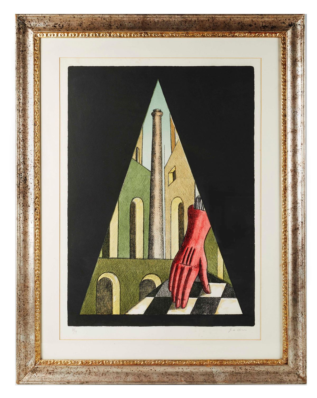 • Lot n° 0075 "Il guanto" - GIORGIO DE CHIRICO (Volo 1888 - Roma 1978) "Il guanto", 1975. Litografia a 8 colori su carta. Cm 75x55. Opera firmata in basso a destra G. de Chirico. Reca numeri di tiratura in basso a sinistra 18/99. Reca timbro a secco Giorgio de Chirico in basso a sinistra. Al retro reca etichetta Alberto Caprini Stampatore Roma a firma Alberto Caprini.Bibliografia: Giorgio de Chirico, Catalogo dell'opera grafica 1969-1977, Edizioni Bora, pag. 227, tav. 202. Il Cairo/Alessandria 1981; C. Siniscalco (a cura di), Villongo 1984; M. Fagiolo, Bologna 1984; M. Fagiolo - G. dalla Chiesa, Ferrara 1985; Washington 1986. - Cm 75x55 - Litografia a 8 colori su carta
