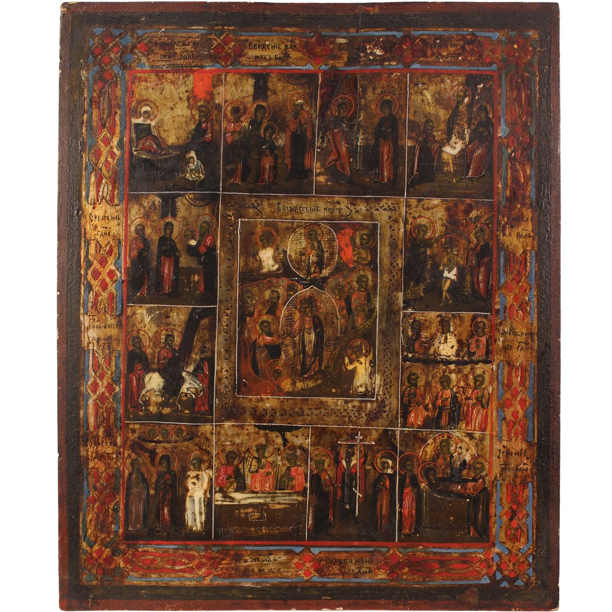 Icona russa - raffigurante Le Dodici Feste, tempera su tavola, difetti - 44,5x36,5 cm. -