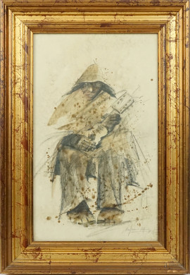 • Lot n° 0767 Figura con chitarra, tecnica mista su carta, cm 37x22, firmato e datato, entro cornice, (macchie).