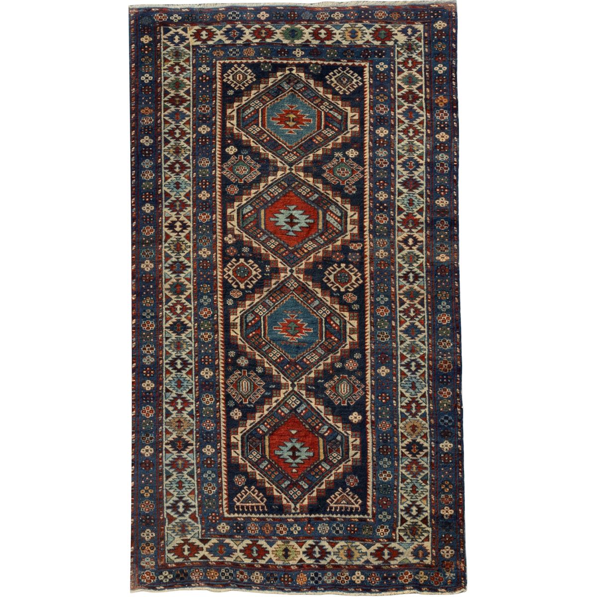 • Lot n° 0380 Tappeto caucasico - decorato con motivi geometrici su fondo blu, usure - 190x114 cm. -