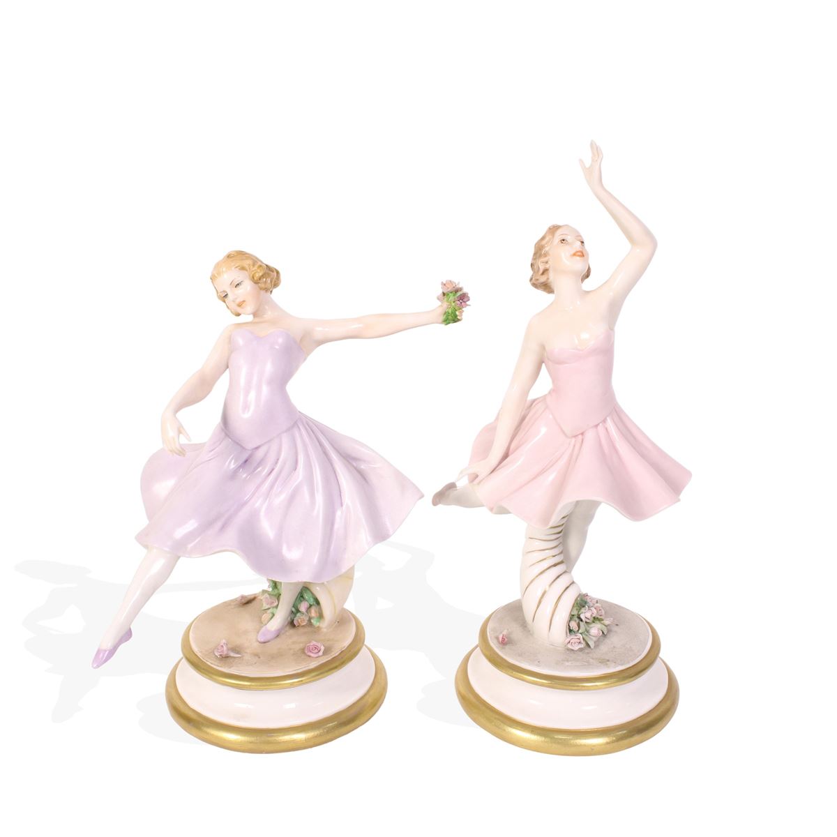 Manifattura Fabris - coppia di sculture in porcellana raffiguranti ballerine, marchi della produzione. - h. 23 cm- h.18 cm -