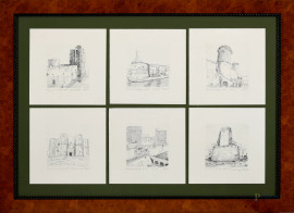 Emmanuele de Giorgis, Sei incisioni a soggetto pugliese entro unica cornice, XX secolo, misure totali compreso passepartout cm 66x95