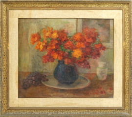 • Lot n° 0328 Natura morta con vaso di fiori e uva, olio tela, XX secolo, firmato in basso a sinistra, cm 54,5x65,5, entro cornice