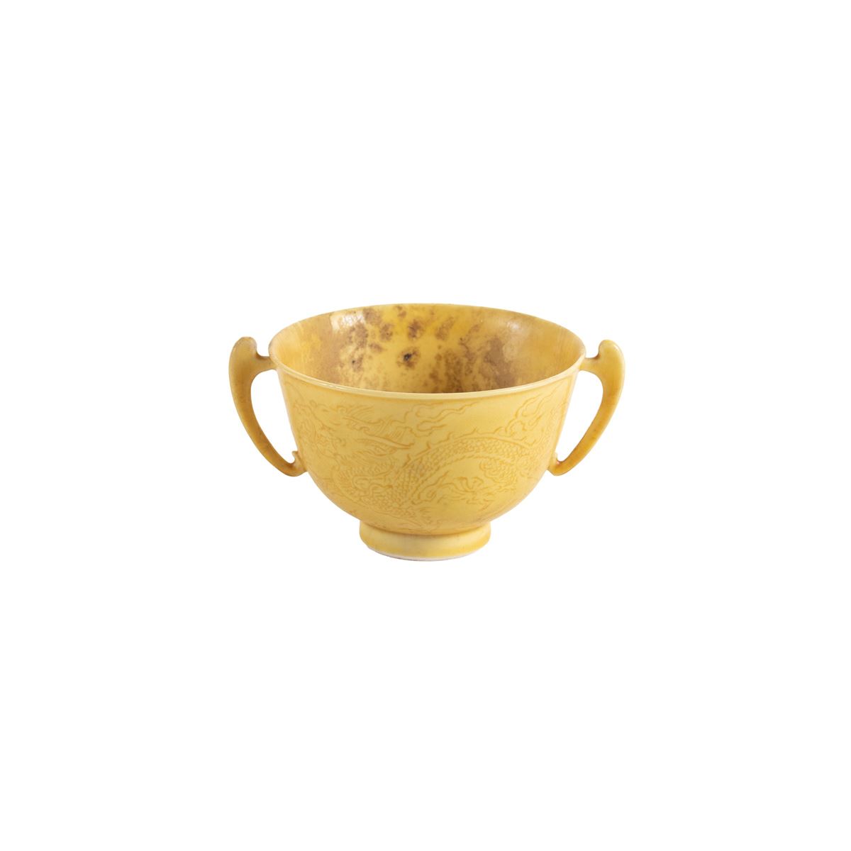 Piccola tazza a due manici in porcellana gialla - incisa con motivi di dragoni, marchi sotto la base - 4x8 cm. -