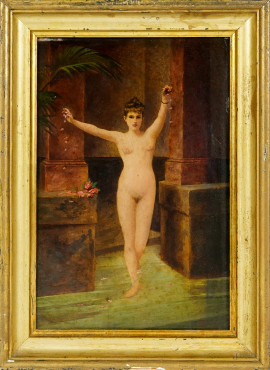 M. Arosa (d'apres) Nudo di donna, XX secolo, stampa ritoccata applicata su tavola, cm 30x20 entro cornice