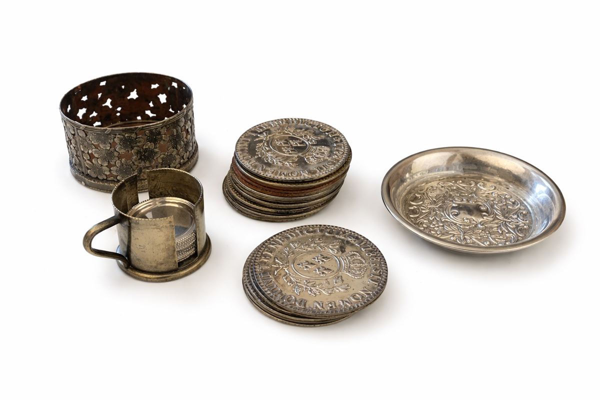 Miscellanea di oggetti per la tavola in metallo argentato - Composta da: una ciotola (D. 13 cm); 16 sottobicchieri (D. 8 cm); una ciotola (H. 6 x D. 10 cm); 12 piccoli sottopiatti (D. 5 cm). I lotti oggetto della presente asta sono ubicati presso un’abitazione privata sita in Roma.La partecipazione all’asta implica la piena accettazione della condizione secondo cui il ritiro dei beni aggiudicati sarà interamente a cura, rischio e spese dell’aggiudicatario.Resta inteso che eventuali operazioni di smontaggio, imballaggio, trasporto e ritiro dovranno essere organizzate direttamente dall’aggiudicatario.Si raccomanda pertanto di richiedere preventivamente tutte le informazioni necessarie, anche al fine di acquisire eventuali preventivi per il trasporto prima di formulare un’offerta. - - metallo argentato