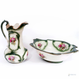 Lavabo con versatoio in ceramica policroma con decori floreali, XX secolo, misura max cm 37x50x38,5 (difetti)