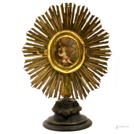 Reliquiario a raggiera con bassorilievo in stucco, XIX scolo, cm 39x27x15, (difetti).