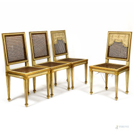 Quattro sedie in legno intagliato, laccato e dorato con seduta e schienale in vimini, cm 92x41x48, XX secolo, (rotture alle componenti in vimini, cadute di laccatura e doratura, usura del tempo)