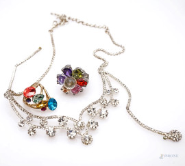 • Lot n° 0978 Lotto di bigiotteria vintage composto da una collana e due anelli con strass multicolor, (difetti e parti rotte)