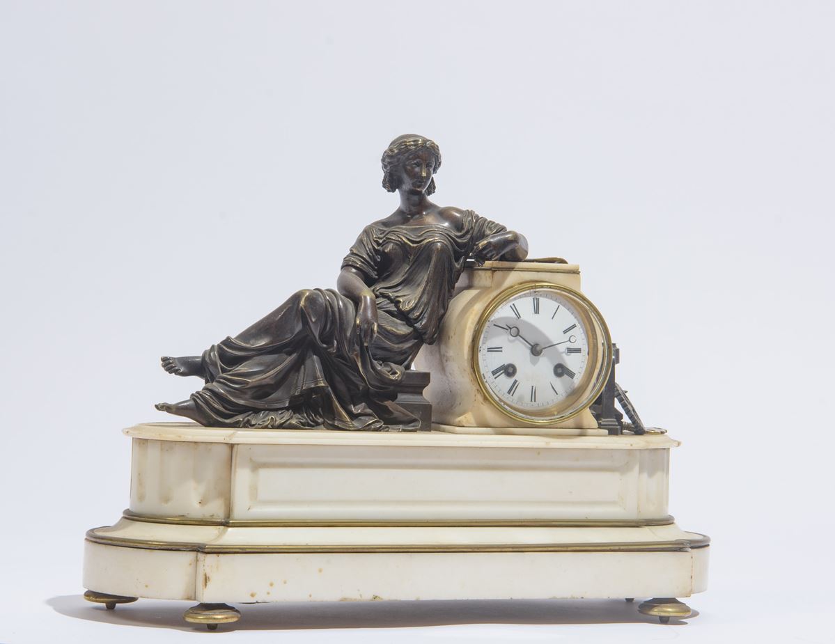Orologio in bronzo dorato e marmo bianco - Sormontato da scultura in bronzo raffigurante figura femminile distesa. Quadrante in porcellana e numeri romani - 28 x 48 cm -