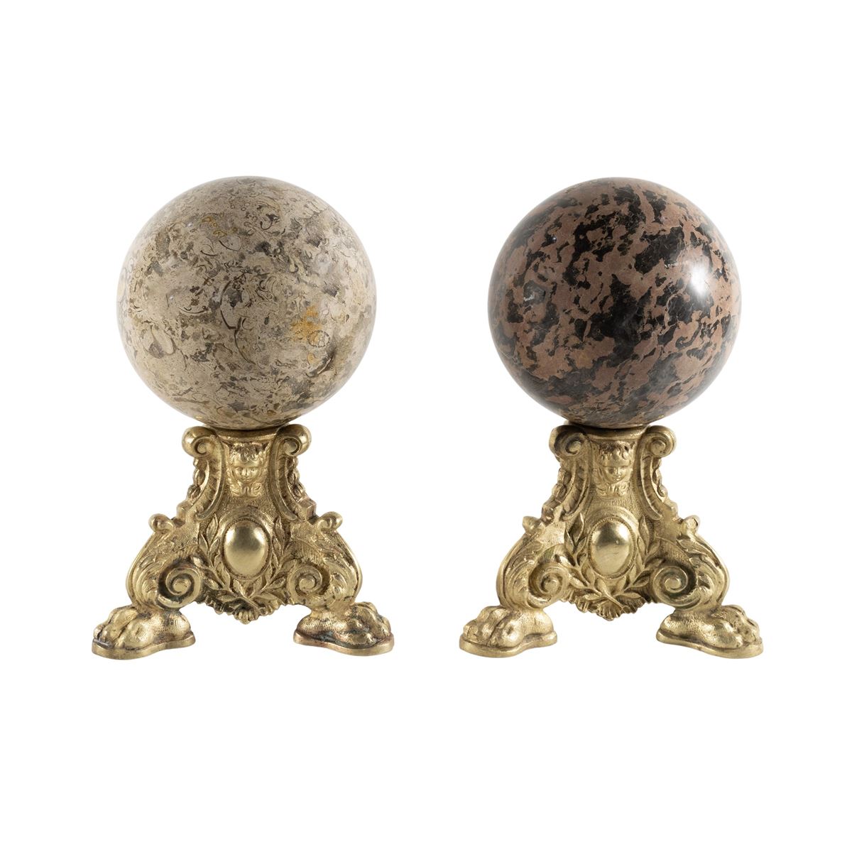 • Lot n° 0185 Coppia di sfere in marmo e pietra fossile - poggianti su basi a tripode in metallo dorato - d. 15 cm. - h. 27 cm. -
