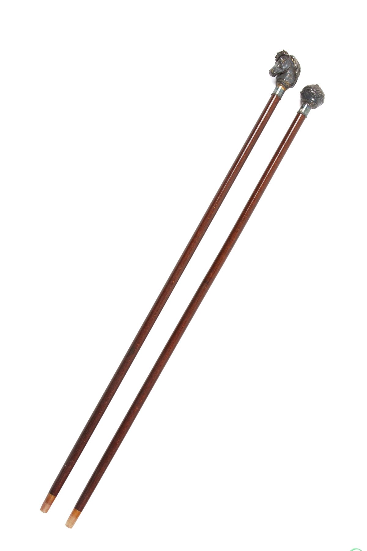 Due bastoni con impugnature a testa di cavallo e con decori floreali - Due bastoni in mogano con impugnature in lamina d'argento una forma di testa di cavallo e uno con decori floreali. XX secolo. Difetti. - -