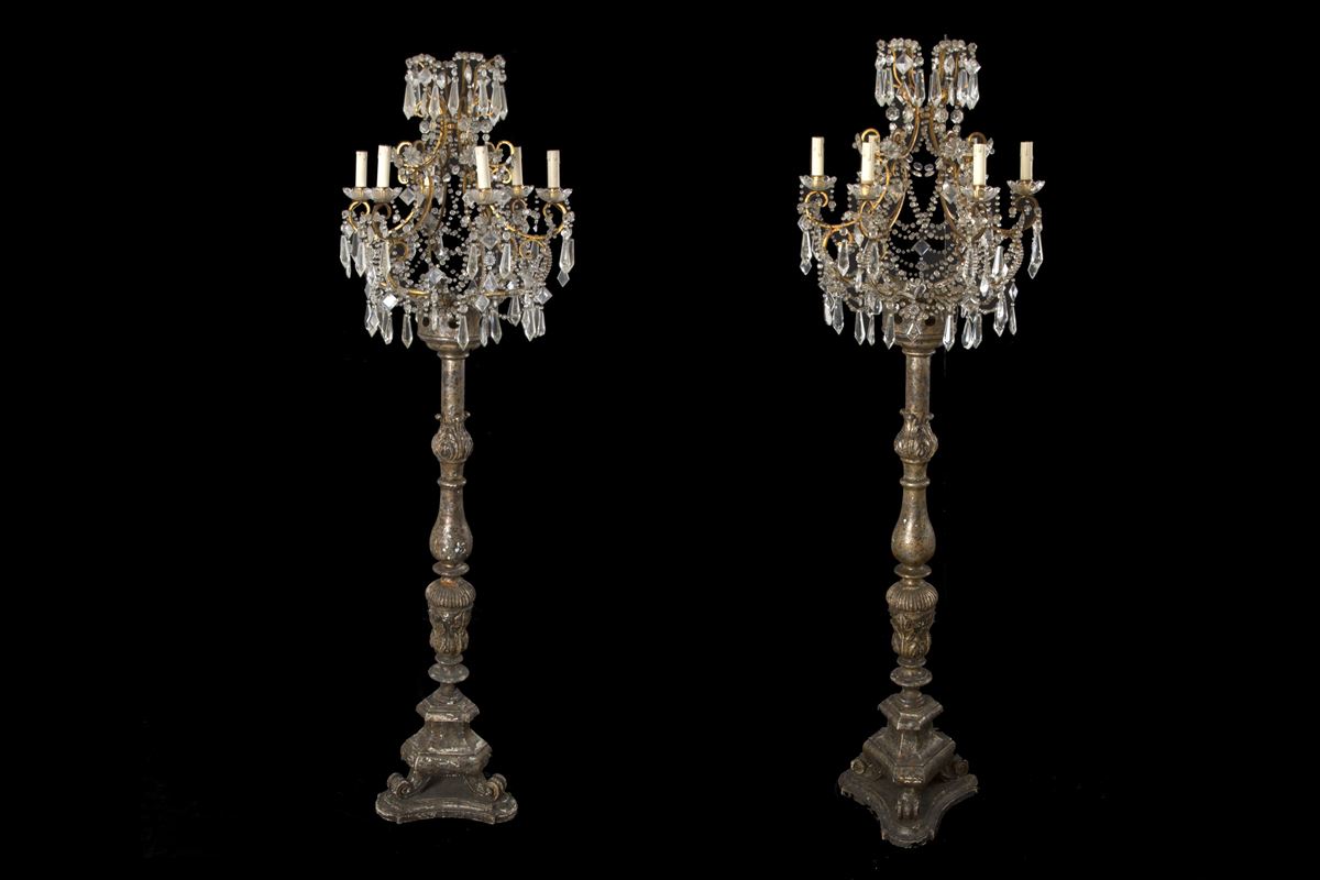 • Lot n° 0180 Coppia di girandolle - Coppia di girandolle con fusto in legno, intagliato e dorato a mecca sormontati da lampada a sei fiamme in ferro dorato e gocce in vetro. Fine XVIII secolo. Lievi difetti e piccole mancanze. - 182x48 cm ca. -