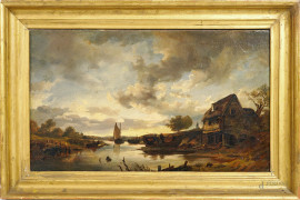 • Lot n° 0194 Paesaggio fluviale con casa, XIX secolo, olio su tela, cm 28,5x48,5, entro cornice