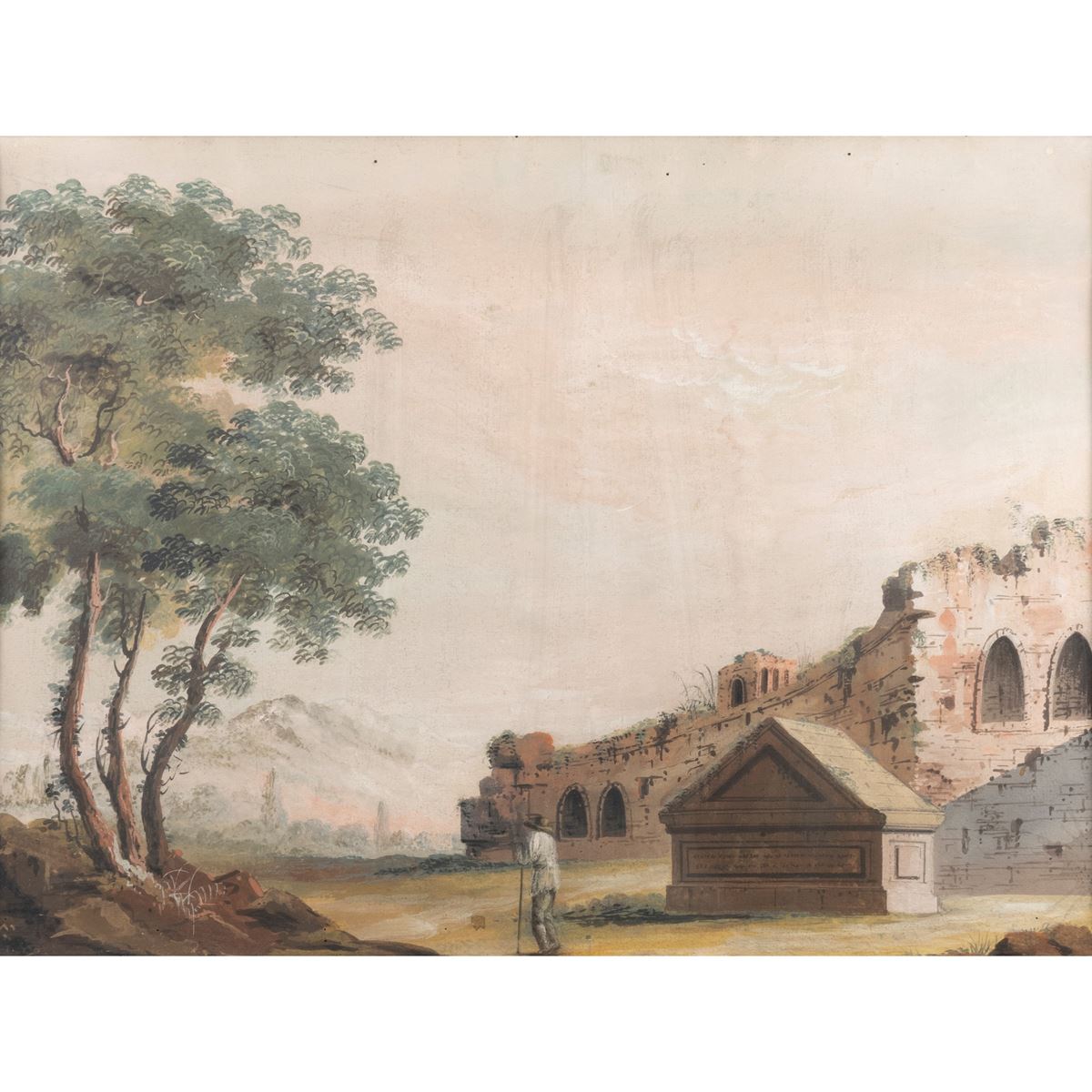 • Lot n° 0159 Pittore del Gran Tour - "Paesaggio con architetture e viandante", tempera su carta applicata su tela, entro cornice - 44x58,5 cm. -