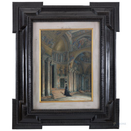 • Lot n° 0105 Carlo Cornaglia, Interno di chiesa con dama, tecnica mista su carta, cm 65x47, firmato e datato "Venezia 1878" in basso a destra, entro cornice