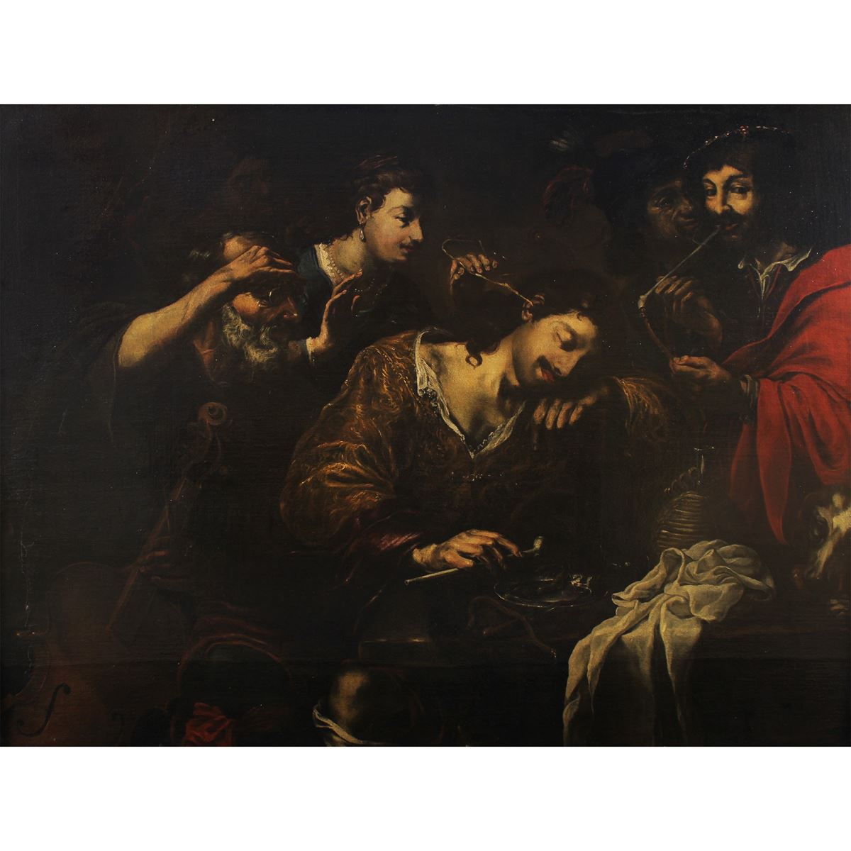 Nicolas Régnier, scuola di - scena di taverna con tabacco (Lo scherzo), olio su tela, entro corniceOpera corredata da scheda critica a cura della Dott.ssa Cecilia Vicentini - 128x175 cm. -