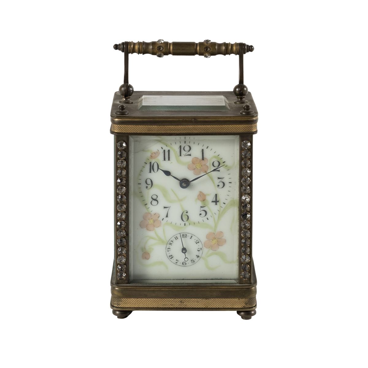 • Lot n° 0342 Orologio cappuccina in bronzo dorato - quadrante in smalto policromo decorato con motivi floreali, difetti - 15x7,5x6,5 cm. -