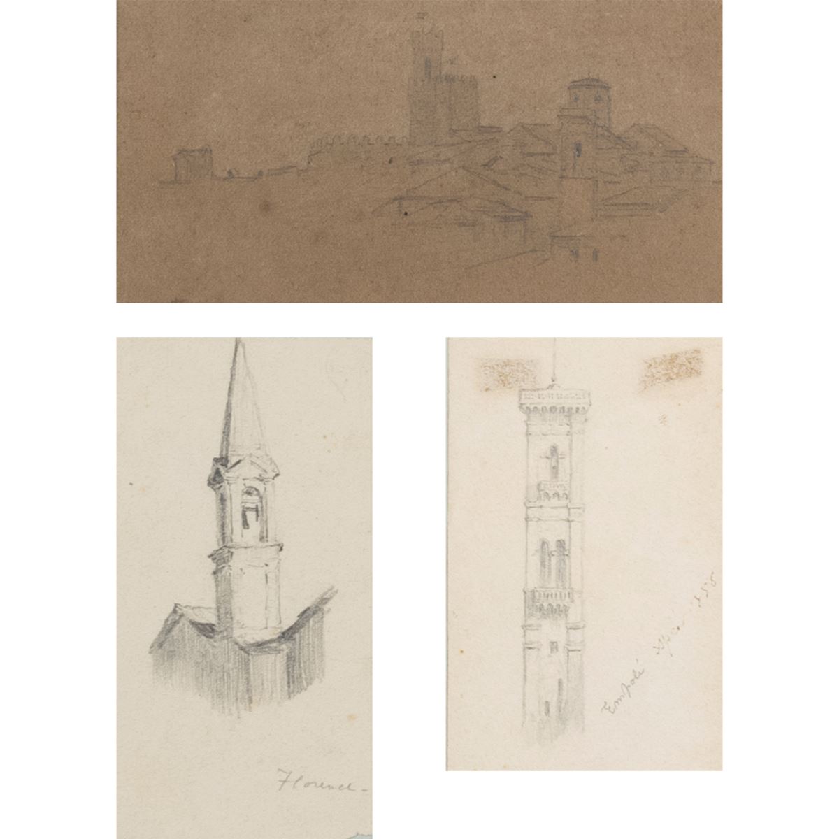 • Lot n° 0480 Elihu Vedder - "Architetture toscane", tre disegni a matita e carboncino su carta, siglati in basso a destra, entro cornici - 8,5x5,5 cm. - 8,5x5,5 cm. - 6,5x12 cm. -
