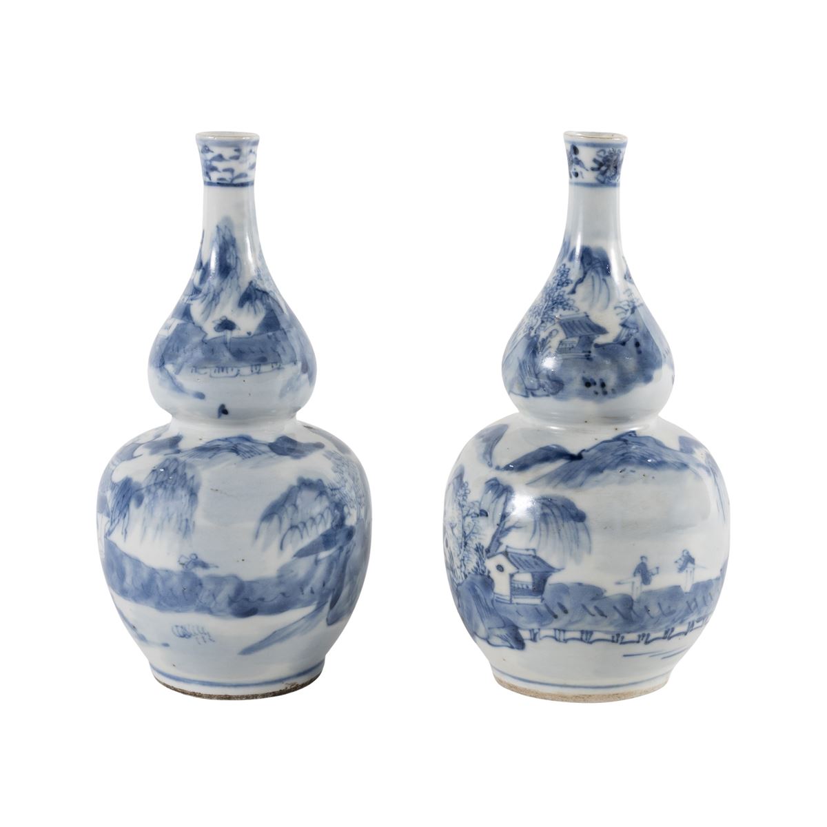 Coppia di vasi a doppia zucca in porcellana bianca e blu - decorati con motivi di paesaggi, marchio alla base - h. 20 cm. -