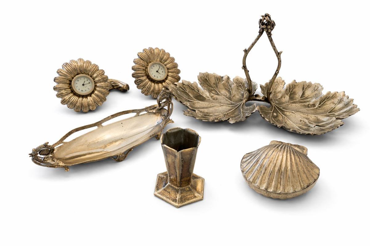 • Lot n° 0344 Lotto di oggetti da scrivania in metallo argentato - Sei oggetti, tra cui: un porta noccioline (10 x 20 cm), orologini (5 x 8 cm). I lotti oggetto della presente asta sono ubicati presso un’abitazione privata sita in Roma.La partecipazione all’asta implica la piena accettazione della condizione secondo cui il ritiro dei beni aggiudicati sarà interamente a cura, rischio e spese dell’aggiudicatario.Resta inteso che eventuali operazioni di smontaggio, imballaggio, trasporto e ritiro dovranno essere organizzate direttamente dall’aggiudicatario.Si raccomanda pertanto di richiedere preventivamente tutte le informazioni necessarie, anche al fine di acquisire eventuali preventivi per il trasporto prima di formulare un’offerta. - -