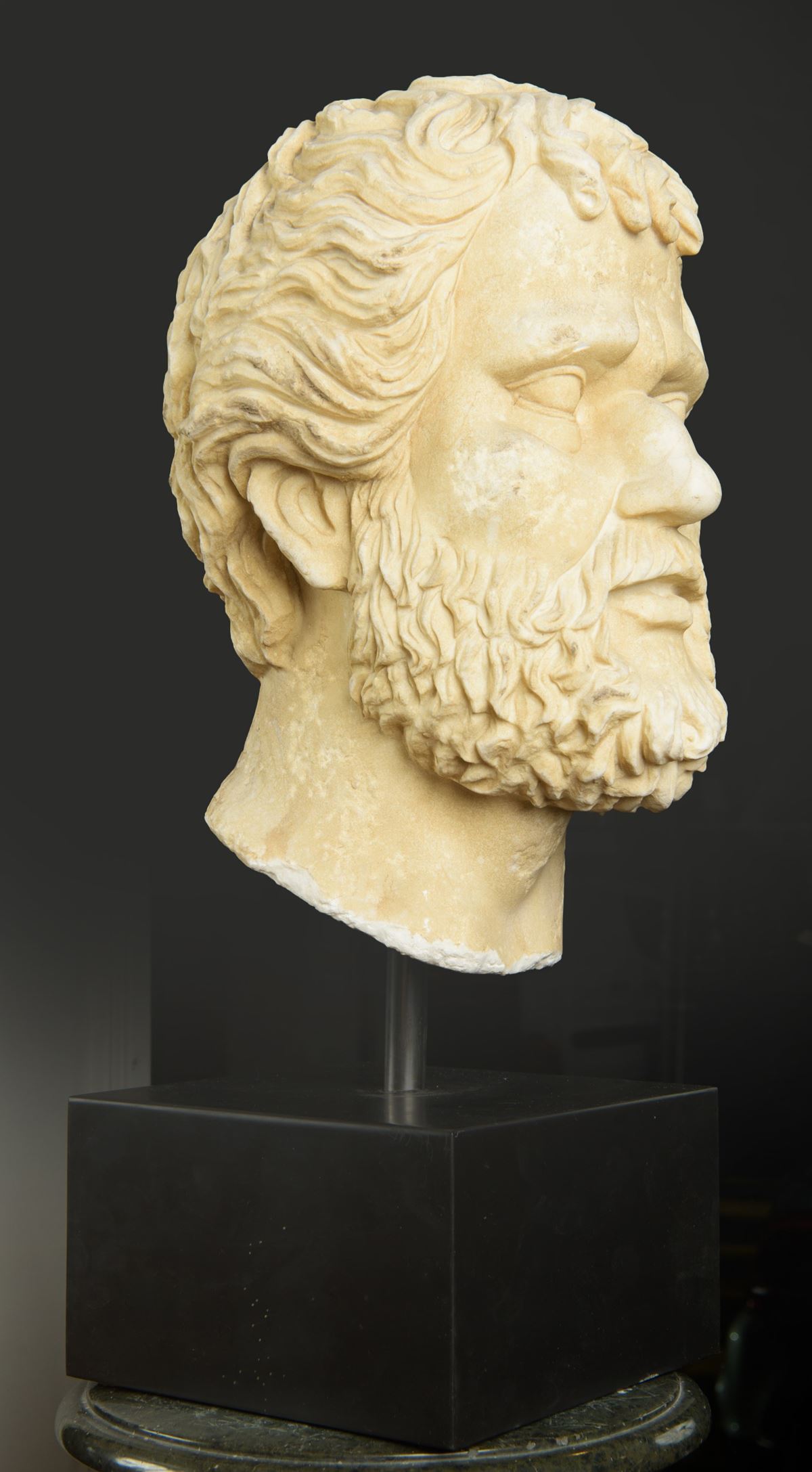 Testa maschile barbata - Scultura in marmo bianco raffigurante testa maschile barbata, ispirata ai modelli della ritrattistica greco-romana di età classica. Poggiante su basamento metallico non coevo. - H. 40 cm x 25 cm / con la base: 60 cm -