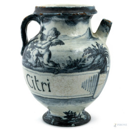 Versatoio da farmacia "Syr Acido Citri" decorato nei toni del blu, XX secolo, altezza cm 25, (difetti, scalfiture, cadute di smalto stannifero)