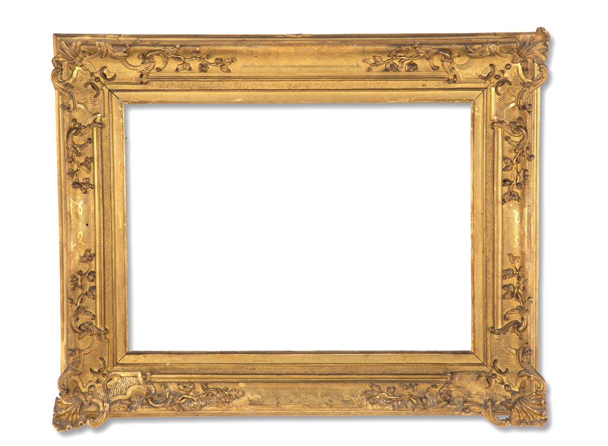 • Lot n° 0195 Cornice dorata - Cornice in legno intagliato e dorato. XIX secolo. Mancanze nell'intaglio.Misura esterna: 69x85 cm ca.Misura luce: 45x62,5 cm ca. - -