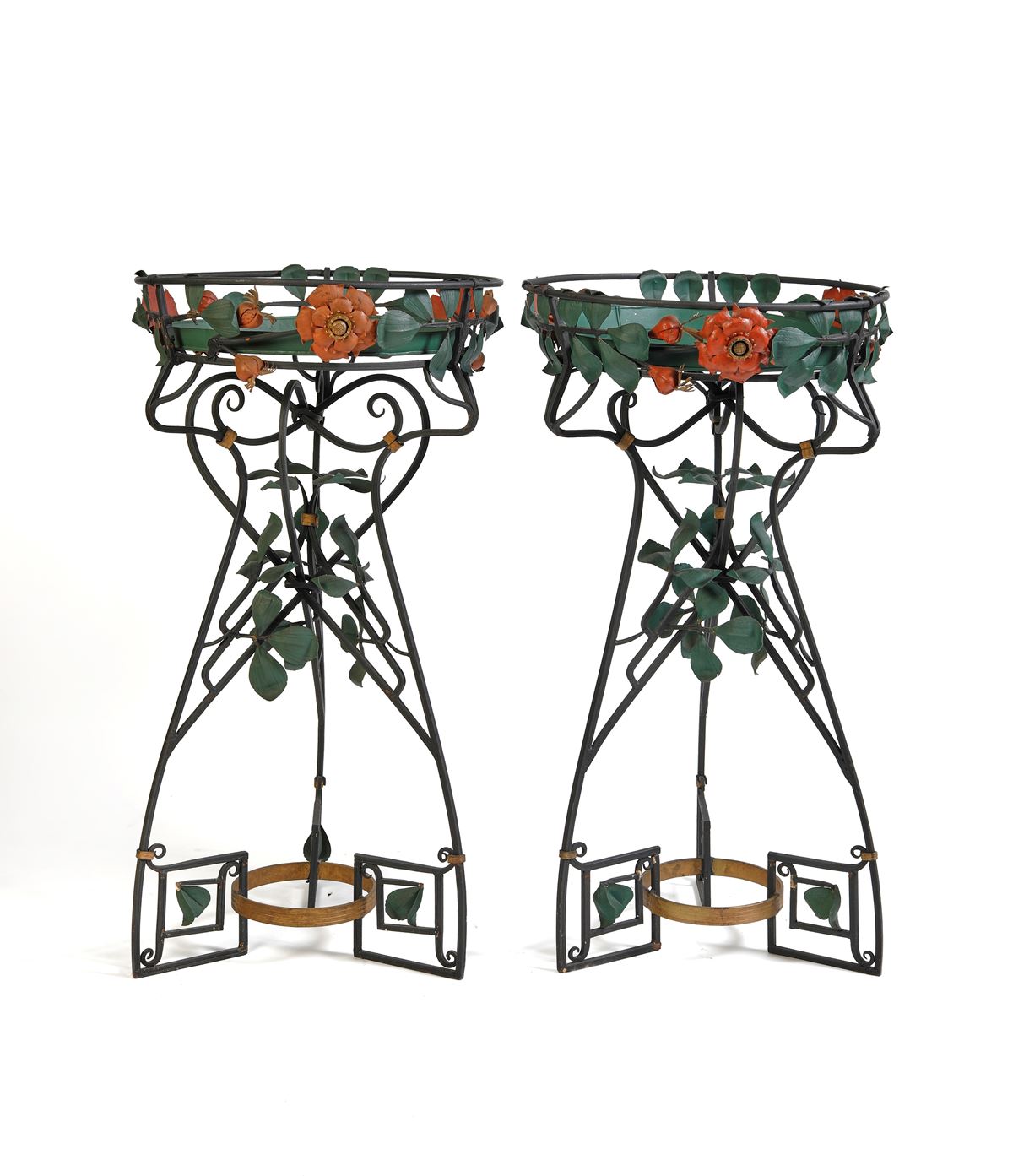 • Lot n° 0092 Coppia di fioriere da giardino - Coppia di fioriere da giardino in stile Art Nouveau. Realizzate in ferro battuto, arricchite da fiori e foglie dipinte. Fine del XIX - inizi del XX secolo. Cm 102x54. Bibliografia: Mobili di Fantasia, Bruce M. Newman. Provenienza: importante collezione privata, Bologna. - Cm 102x54 -