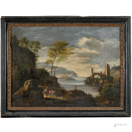 Paesaggio fluviale con figure, XVIII secolo, olio su tela, cm 71x97 entro cornice